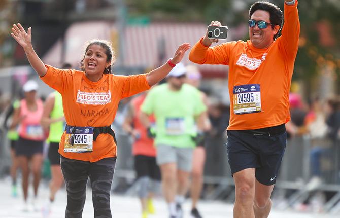 A woman and man, both wearing orange T-shirts with the words “Fred’s Team,” flash victory signs and thumbs-ups mid-race.